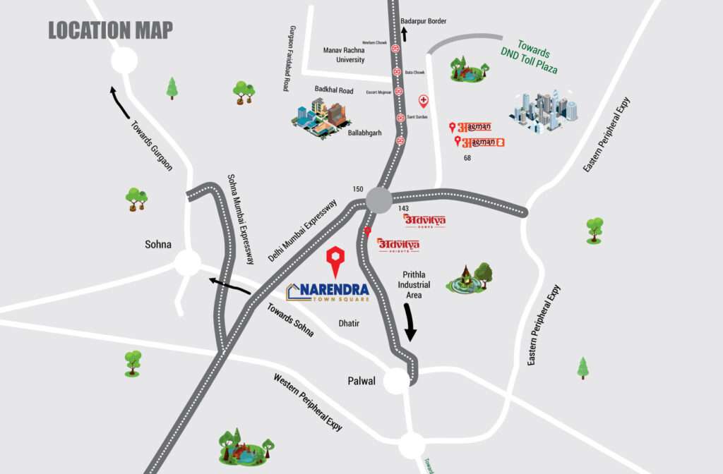 Advitya Plots at Prithla / Narendra Town Square is located in Sector 6 Prithla, South of Faridabad near Mathura Road. This development enjoys excellent connectivity, being directly connected to Delhi, Sohna, Gurgaon, Noida, Palwal, Mathura, and Jewar Airport. If you need more detailed information or assistance regarding this project, feel free to ask our Sales Team – 7071-803-803